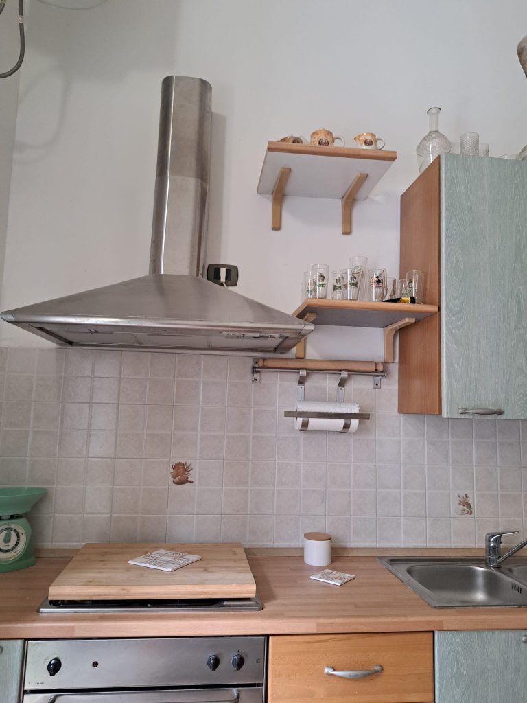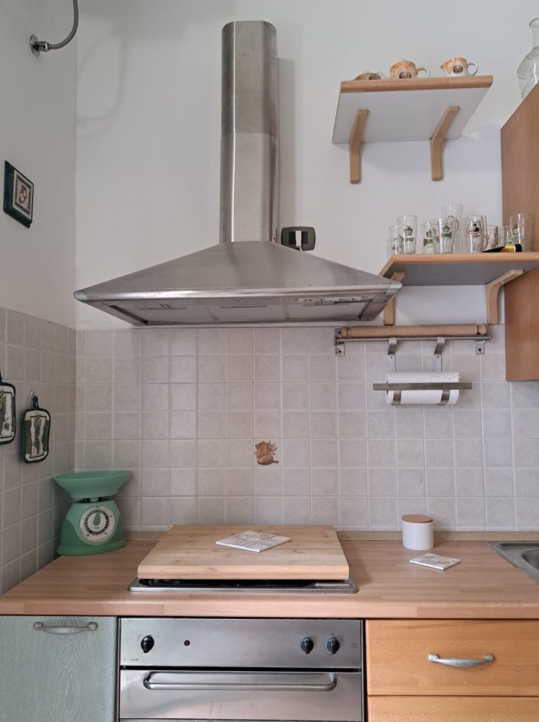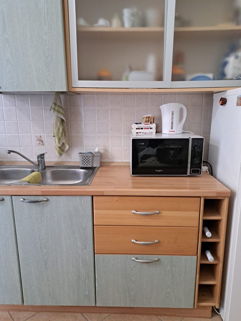 Zur Ausstattung des Ferienhauses MiRo gehören Geschirr, Töpfen und Pfannen, Kaffeemaschine, Mikrowelle, Haartrockner, Bettwäsche und Handtücher.