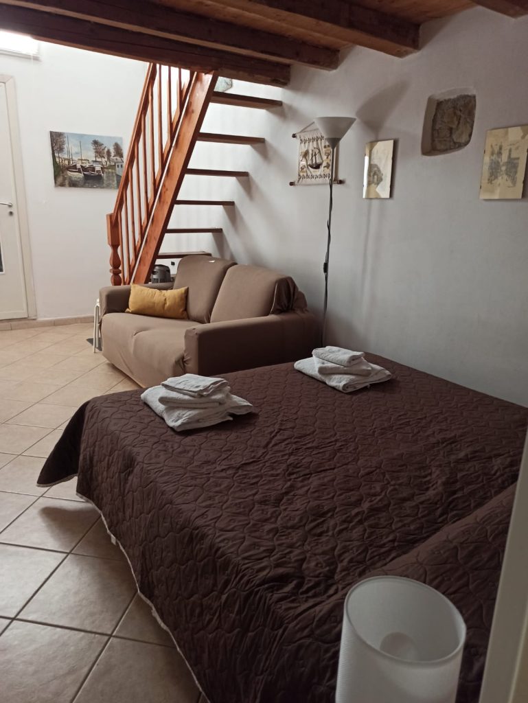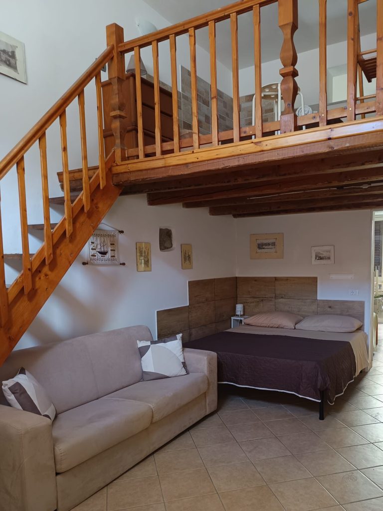 Troverete l’ingresso a pianterreno con cucina abitabile e a seguire la zona notte disposta su due livelli comunicanti. Ideale per famiglie, la camera a pianterreno presenta un letto matrimoniale e un divano letto a una piazza e mezza. La seconda camera da letto si trova su un soppalco e dispone di un letto matrimoniale e uno singolo, raggiungibili attraverso una graziosa scala in legno.